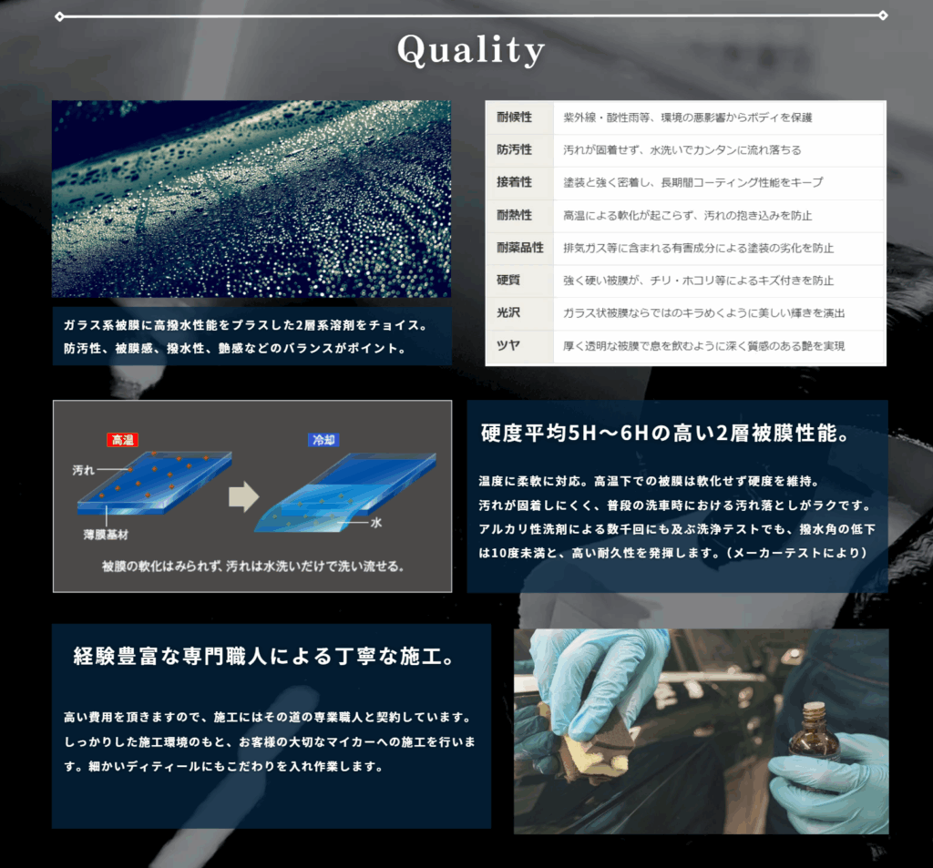 運営母体でもあるコレクトオート株式会社と長いお付き合いをしている職人さんとの協業により数社の液剤メーカー候補から選んだ、こだわりのコーティング。